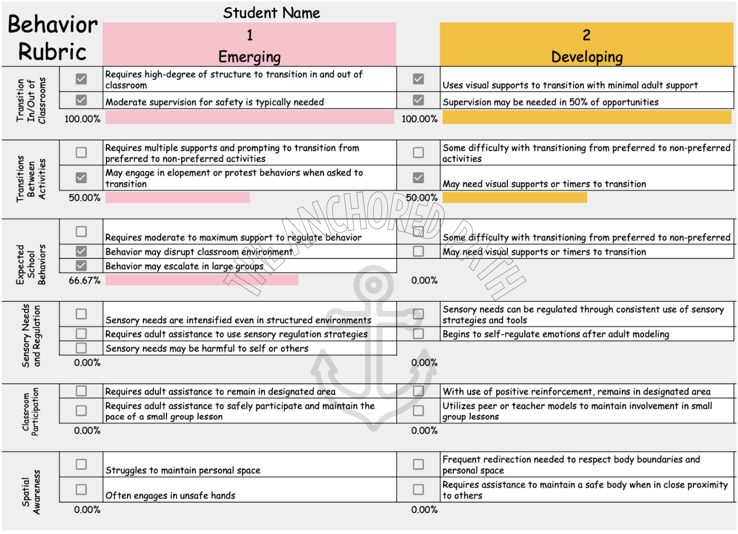 This editable rubric provides a framework for monitoring behavioral growth in real-world school settings. The rubric organizes behavior goals into six categories- Transitions In/Out of Classrooms, Transitions Between Activities, Expected School Behaviors, Sensory Needs & Regulation, Classroom Participation, and Spatial Awareness- with clearly defined levels of progress: Emerging, Developing, and Proficient. It's the perfect tool for special educators, behavior specialists, therapists, and support staff looking to make behavior progress clear, actionable, and measurable. This is a digital download that will open in Google Sheets.